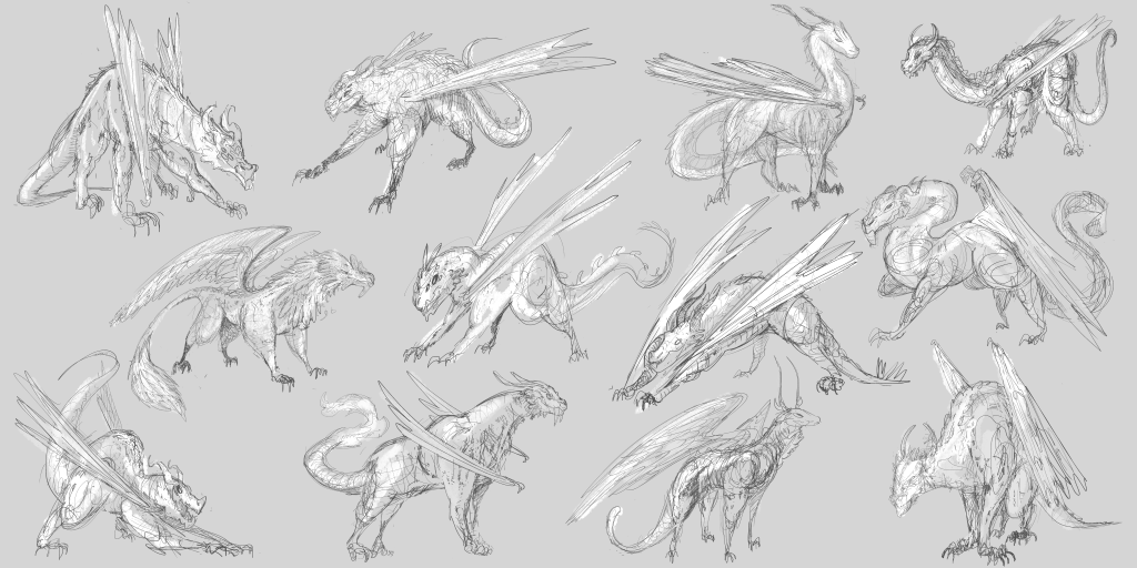 Simple true, but I’ve had a few subsets of ideas I was eager to explore within the simple concept. What makes a design a dragon? It is going to need all the basics, a body, head, limbs, wings, and a tail. So all of these have those.