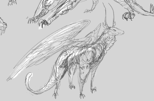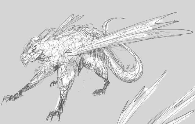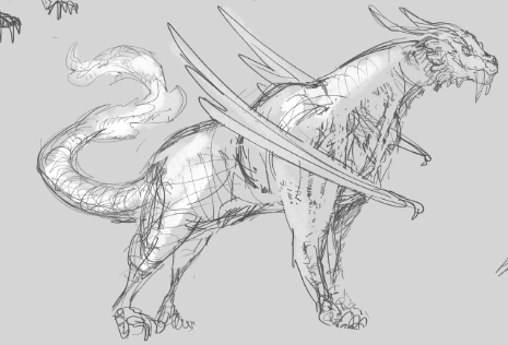 I’m most fond of the first sketch, which was mainly referenced from prehistoric saber tooth cats. I think the body shapes are pretty fun, and I love a top heavy creature. I gave it the flappy bat wings, to push it back to the dragon territory, but I don’t think I really succeeded in doing so. Still, a cool creature I’d like to get back to some day.